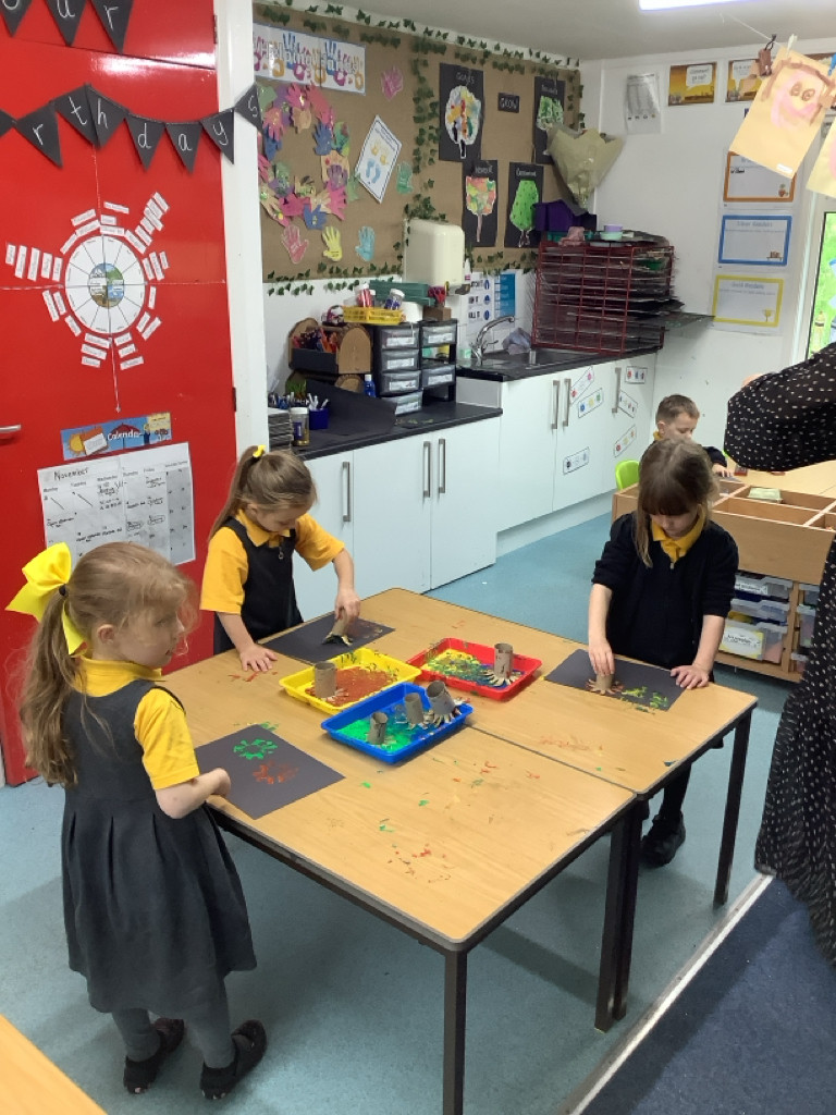 To celebrate Bonfire Night we made a variety of different firework pictures. We experimented with dropping pipettes of paint onto our page and then using straws to blow the paint around. Another way was using toilet roll cut into firework shapes and printing them with paint and glitter.