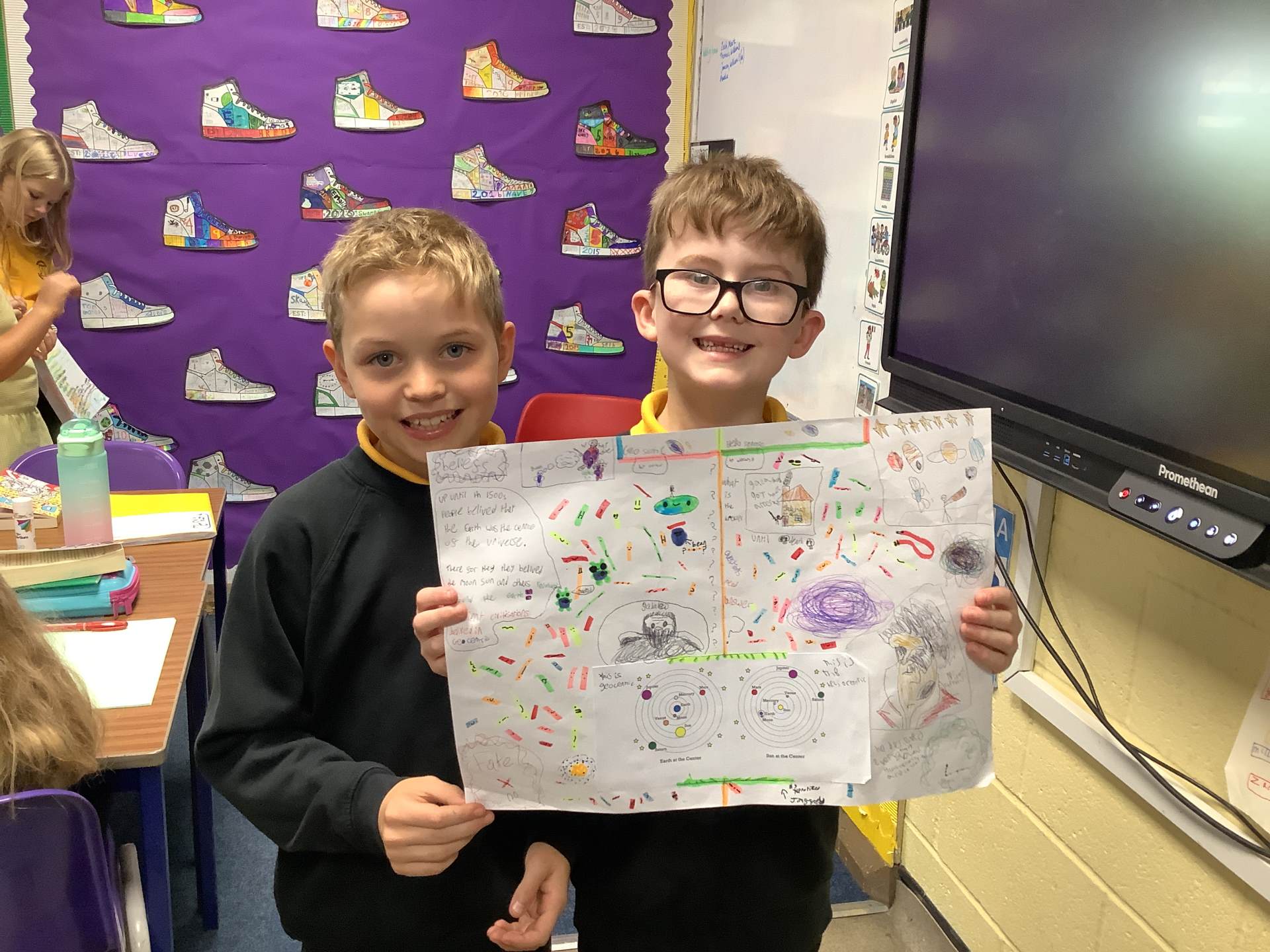 We have been working hard in science and thinking about the different historic beliefs and theories of the solar system. Throughout history, scientists and astronomers have explained different theories about the Earth or the Sun being the centre of the universe. We created some pictures to demonstrate these theories.